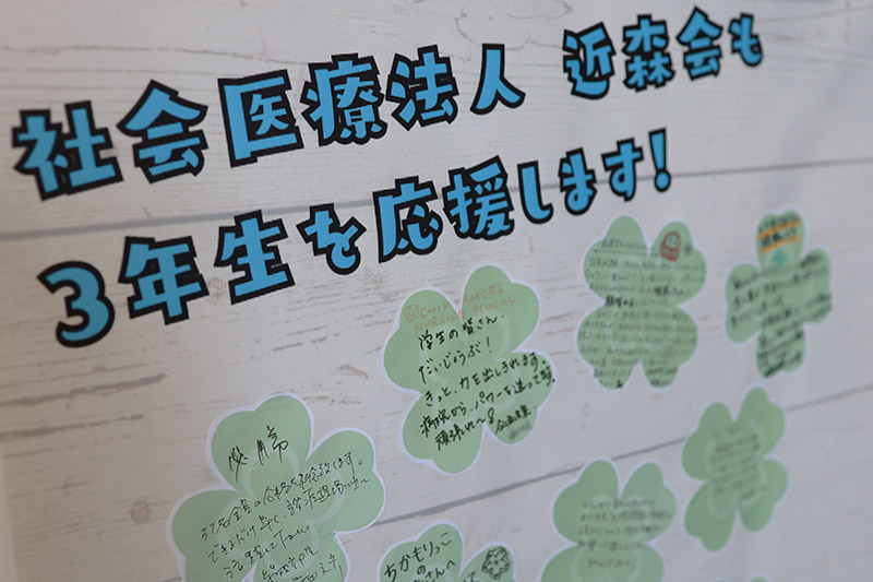 また、学校1階には、3年生の願いが込められた「願い札」をはじめ、1・2年生や教職員、さらに法人の皆さまから寄せられたたくさんの温かい応援メッセージが掲示されています。